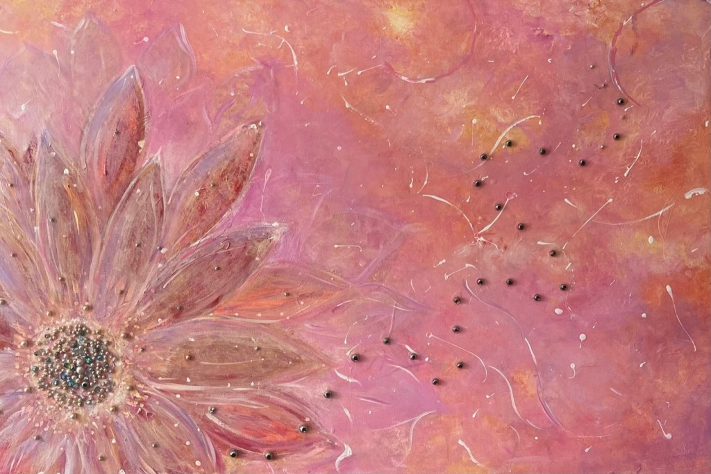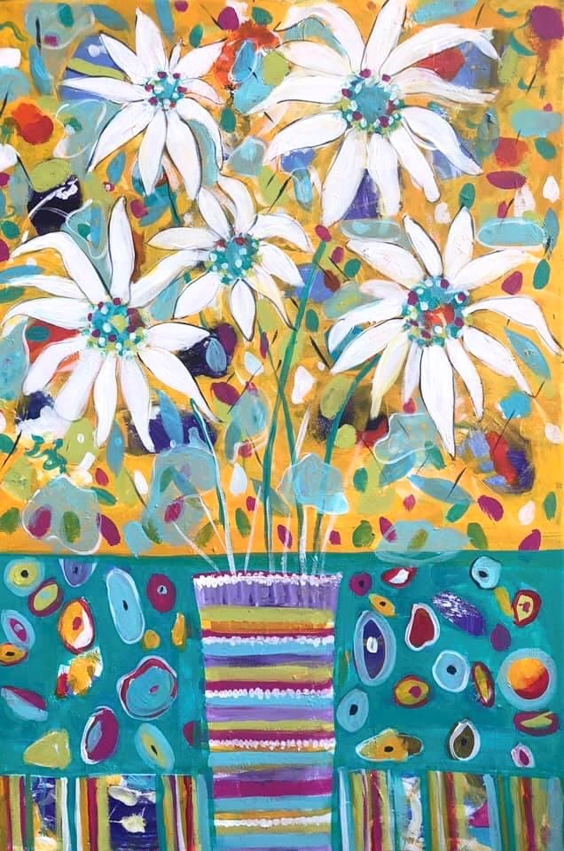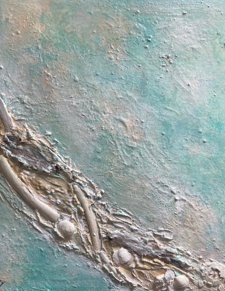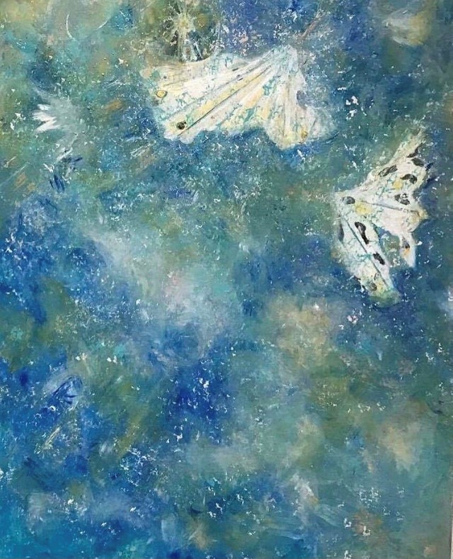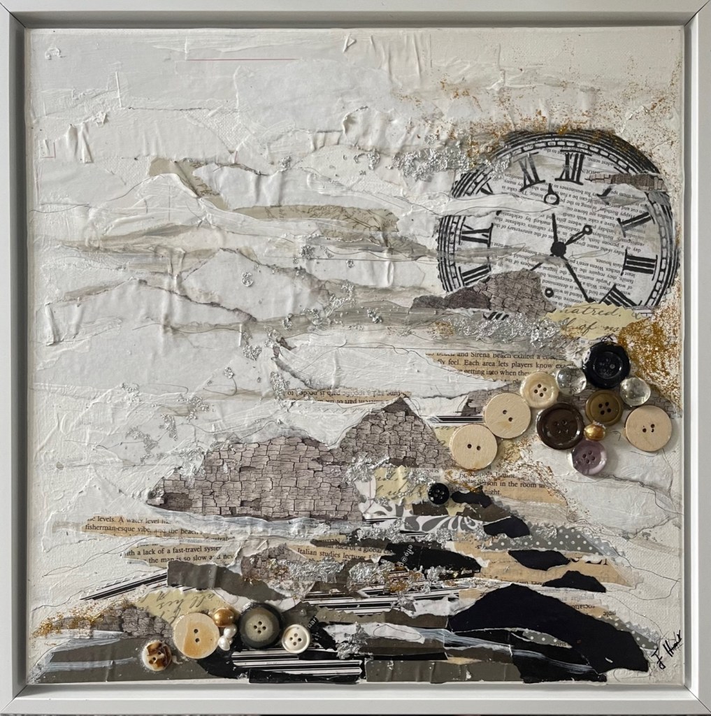 The canvas size is 16 x 20″. Materials include colored papers, tissue paper, magazine pages, music sheets, handmade paper, acrylic paints, ink pens, shells, buttons, gems, ribbons. Please feel free to bring a few personal beads, buttons, charms, photographs, or any nostalgic object you wish to add to your tree.