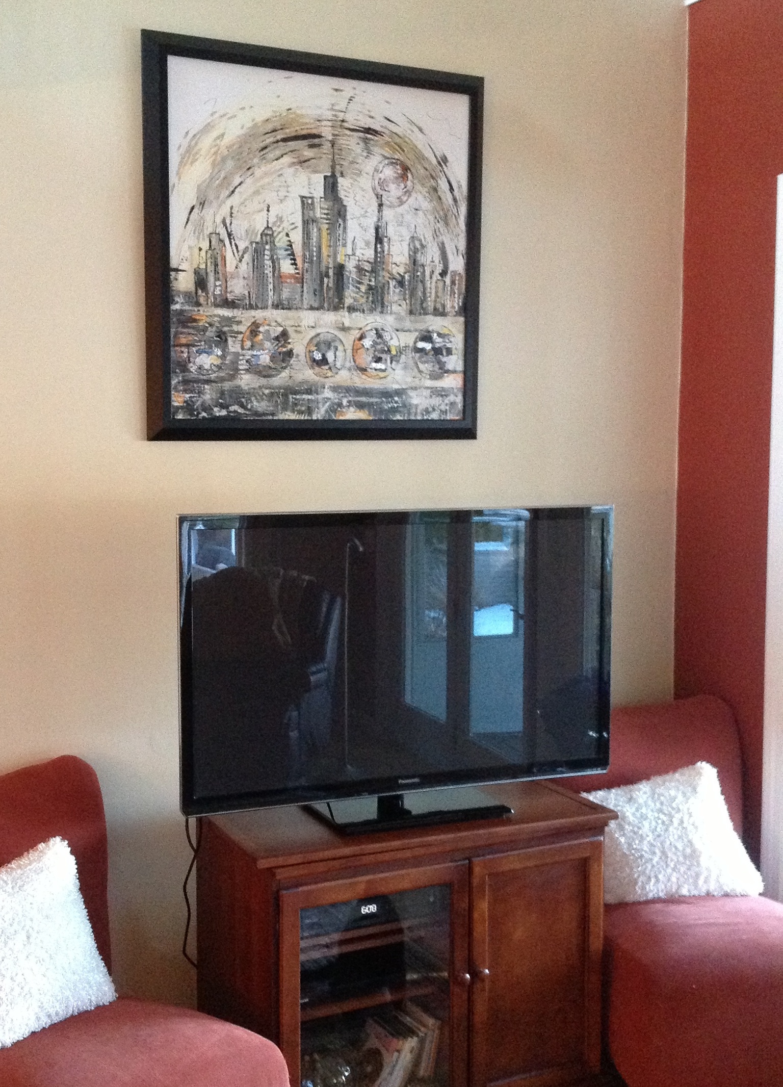 We recently experienced one of the world’s worst violent massacres in the small town of Sandy Hook, CT. My granddaughter lives in neighboring Newtown and I know the area and many of the people there well. It is sometimes hard for me to articulate with words what I am feeling. Urban Rumble was inspired by the events that transpired at Sandy Hook, my beliefs that there are cracks in our society, core values and foundations have been shaken and there is much distress and unease in the world. There was no pre-meditative planning for this painting, rather a spontaneous expression of the feelings within me. This is a painting I love and have enjoyed the many conversations and questions it provokes with the viewer.